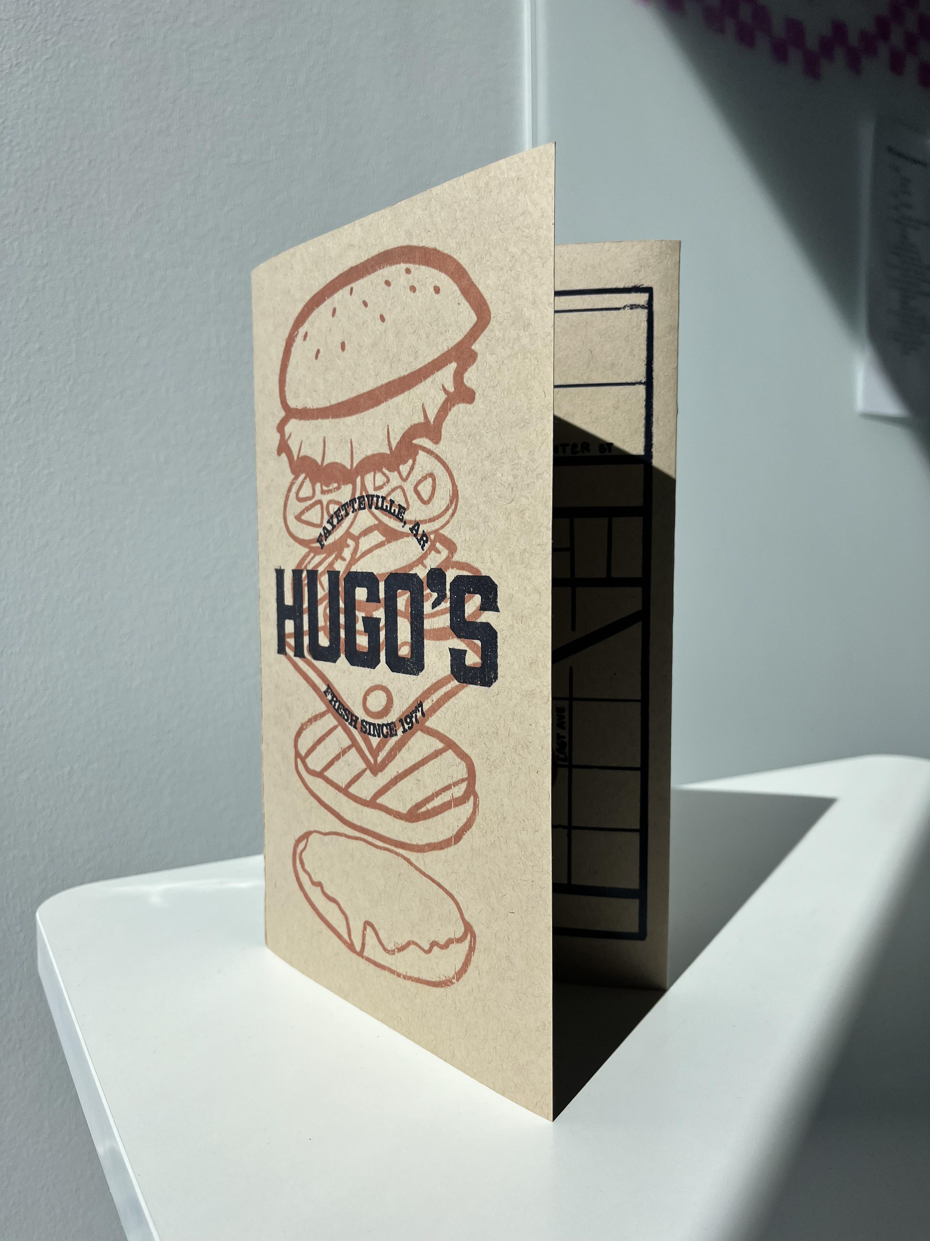 Tasked to redesign a local menu in Typography 1, I chose to redo the menu of beloved and classic burger restaurant Hugo's in Fayetteville, Arkansas. This project presented a challenge in relaying a large amount of information and text in a consumable and non-overwhleming way. It also seeks to